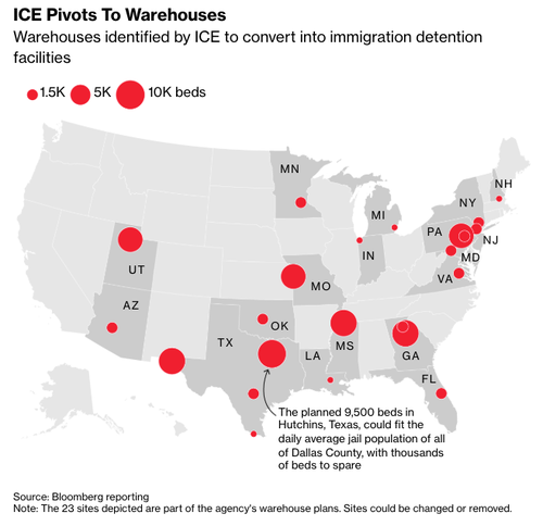 Bloomberg reports that Immigration and Customs Enforcement’s rapid move to build out a network of warehouses is being fueled by $45 billion from the signature “One Big Beautiful Bill Act.” This includes the most recent purchases of a warehouse in Hagerstown, Maryland, and another in Surprise, Arizona, totaling $172 million. A third in El Paso, Texas, will be one of the largest of its kind, with 8,500 beds.