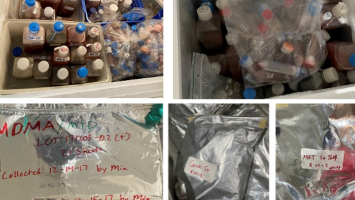 Photos from their review show freezers packed with numerous small bottles and sample containers holding what the caption identifies as blood and other fluids, plus sealed bags labeled with apparent drug shorthand (for example “MDMA,” “Coca,” and “Met”), suggesting the freezers were being used to store both biological materials and suspected narcotics-related items.