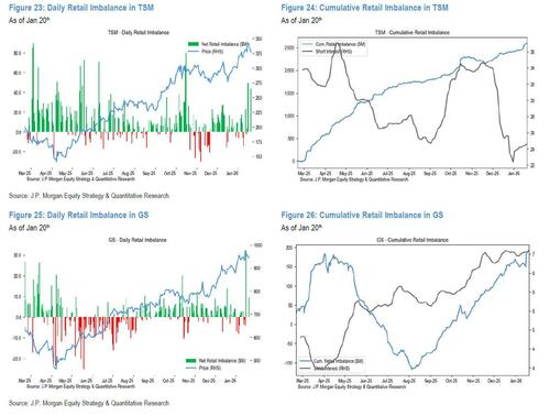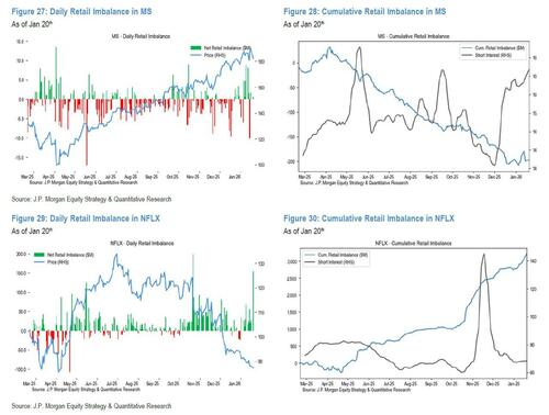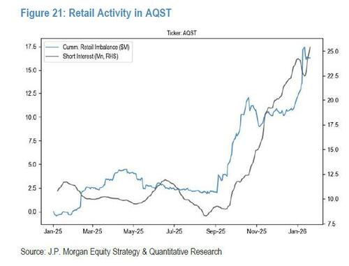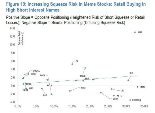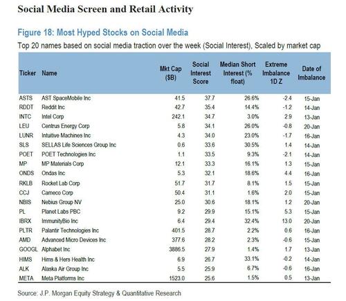 Next, JPM flags several stocks that are heavily mentioned on Social Media and have high Retail buying as well as high Hedge fund Shorting. These stocks may experience unexpected flows in case of increased activity.