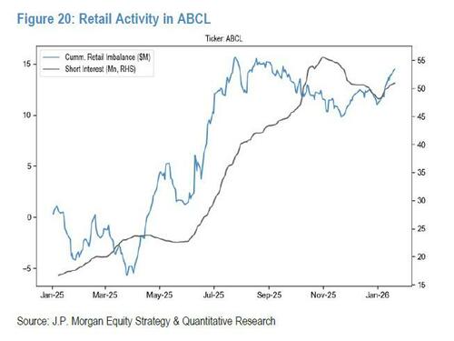 - ABCL ($1.1M bought last week, 0.5z): The stock surged by over 30% between January 5th and January 12th, following the announcement of first patients dosed in its Phase 2 trial for a drug targeting vasomotor symptoms (link). Retail investors have shown interest since April 2025, with net purchases totaling $20M. These developments have occurred amid high short interest, currently around 22.5% of the float, which has increased by 5% since September 2025.