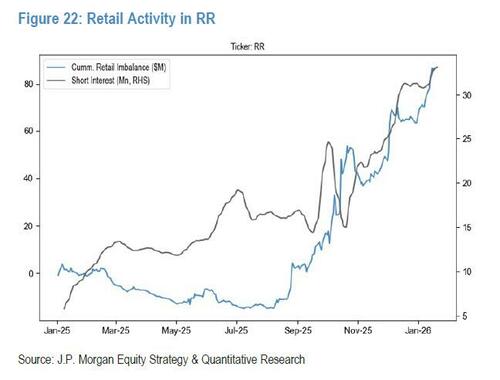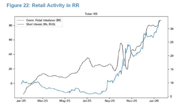 - RR ($9M bought last week, 1.3z,): The stock rose by over 14% on January 8th, accompanied by sustained retail interest since September 2025, with net purchases totaling $85M. These gains have occurred against a backdrop of rising short interest, currently at approximately 30% of the float, which has sharply increased by 10% in January 2026.