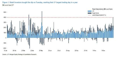 … but also saw an explosion of retail BTFD activity during Tuesday’s rout which saw institutions and algos all puke. A few hours later, we found that retail was right again, and stocks resumed their meltup to new record highs.