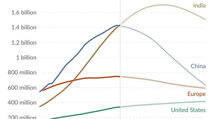 In contrast, the United States and Europe are projected to change more gradually. The US is expected to grow slowly and steadily, reaching about 420 million people by the end of the century. Europe’s population, meanwhile, is projected to decline. Based on these figures, its population peaked around 750 million in 2020, and is expected to fall to about 590 million by 2100, not far from China’s projected level.