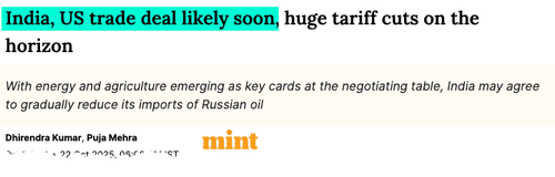 The U.S. and India are close to a possible trade deal that would reduce tariffs on Indian exports to about 15% to 16% from the current 50%, according to the Mint. In return, India may reduce imports of Russian oil and open its market to non-genetically modified American corn and soymeal products. The bilateral trade agreement could be announced when President Donald Trump and Prime Minister Narendra Modi meet at the ASEAN Summit in Malaysia between Oct. 26 and 28.