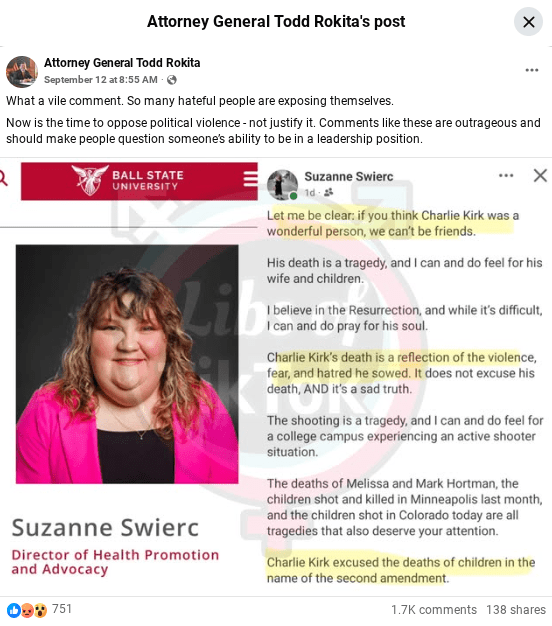 This post was clipped, highlighted, and delivered to the general public like a head on a stake by AG Rokita, who chose to preface a thoughtful and emotional post by a Ball State University employee as nothing more than a hateful spiel by someone who wanted Kirk dead. Nothing could be further from the truth and yet, this is how Todd Rokita chose to put it on blast: