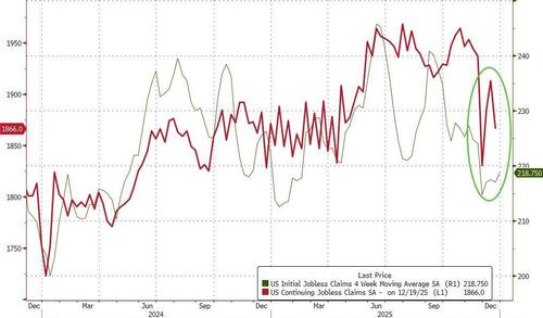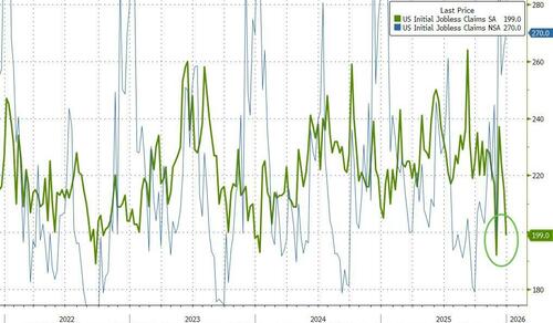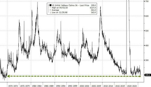 The number of Americans filing for jobless claims for the first time plummeted last week to 199k – the lowest since the Thanksgiving week plunge and pretty much the lowest since