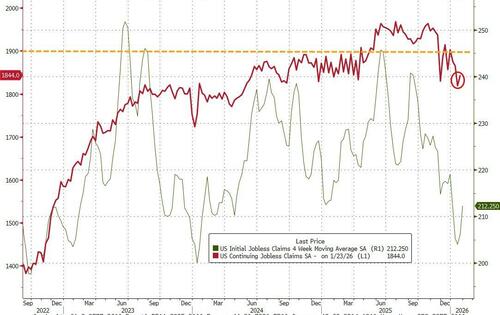 Continuing claims also rose modestly, but less than expected. 1.844mm Americans are currently filing for jobless benefits (below the 1.85 million expected, but up from the 1.819 million the prior week).