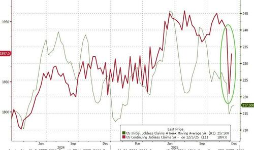 After the Thanksgiving Week debacle, the number of Americans filing for jobless benefits for the first time remains back in the same – very low – range it has been in for the last four years at 224k…