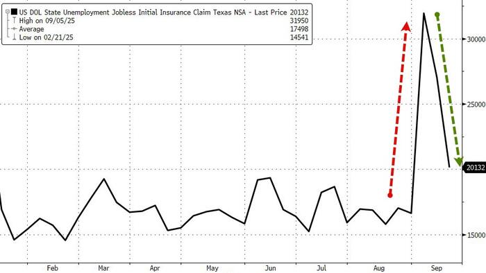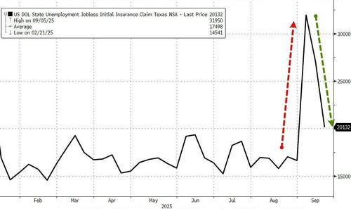 Whatever it was that cause Texas to see a dramatic surge in jobless claims (some mentioned the start of the school year) has gone now as Texas claims revert back to ‘normal’…