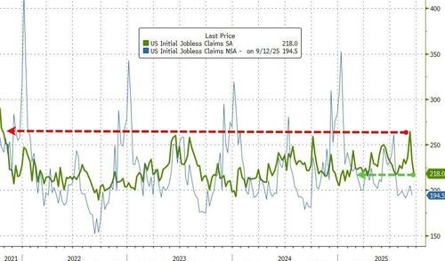 The brief hysteria of a surging pace of initial jobless claims is now well ans truly back in the dustbin of data-driven-drivel history as the number of Americans applying for unemployment benefits for the first time fell to 218k last week (practically the lowest year-to-date) after surging to four year highs on the back of Texas trouble…