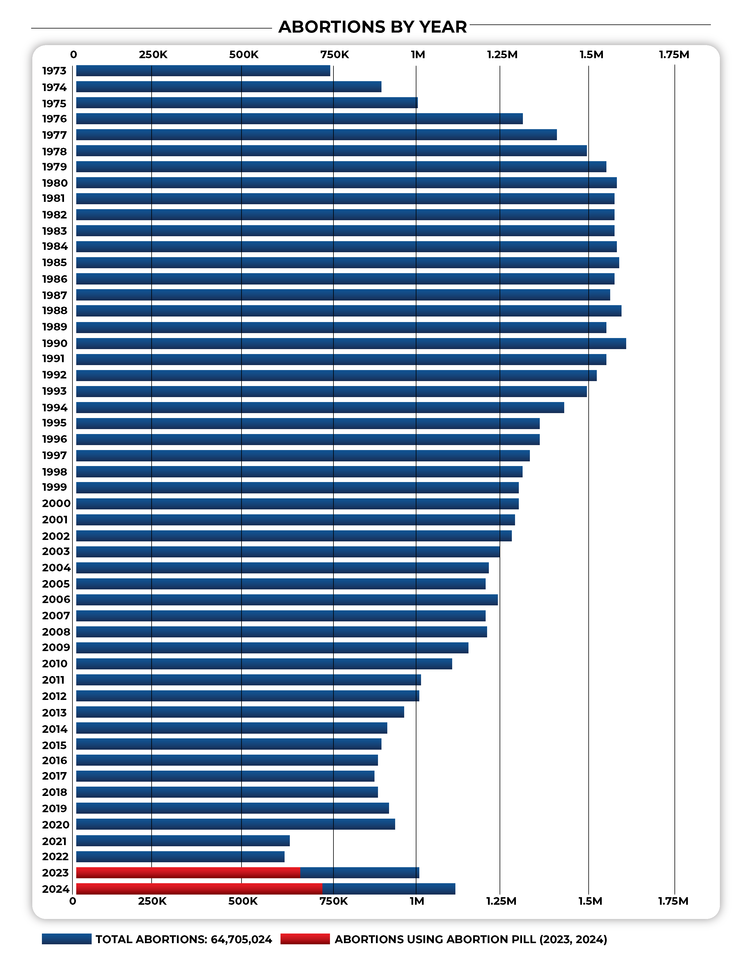Terminated pregnancies have claimed 65 million lives since 1973, nearly the entire population of France or of Texas and California combined. Legalized nationally under Roe v. Wade, abortion rates exploded in the 1970s, peaked in the 1980s, and began their steady decline from 1990 to an all-time low in 2017—only to spike to a 14-year high after the 2022 Dobbs decision. Even without a constitutional right, American abortions are still tracking at one million per year.