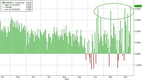 …That question is now being priced in. As long as the 1-year silver swap minus US rates remains below the red line, silver’s upside pressure continues. No one knows where supply and demand will reconnect. … ”