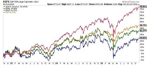 Yet, retail investors are chasing dip‑buying, as the “Fear of Missing Out” dominates flows, with many assuming another surge in asset prices is just around the corner. Maybe that is the case. However, if you examine the breadth of the market, you’ll see cracks. Large‑cap indices may hover near highs while small and mid‑cap stocks lag significantly. More notably, the divergence between the market-cap weighted and equal-weighted S&P 500 (RSP) suggests breadth remains weak, lulling investors into a false sense of safety