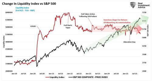 In other words, just as Pavlov’s dogs would start salivating at the “ringing of the bell,” investors are “chasing speculative assets” simply on the assumption that the “food” will arrive. But, as noted, while the Federal Reserve has trained investors to “buy the dip” over the last 15 years, that market has detached from underlying liquidity. In other words, since 2022, investors have been chasing stocks higher and drifting from one “Fed statement” to the next, looking for clues as to when monetary accommodation will return.