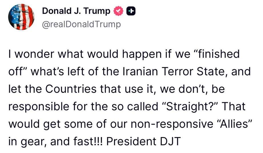 President Donald Trump posts Wednesday: I wonder what would happen if we “finished off” what’s left of the Iranian Terror State, and let the Countries that use it, we don’t, be responsible for the so called “Straight?” That would get some of our non-responsive “Allies” in gear, and fast!