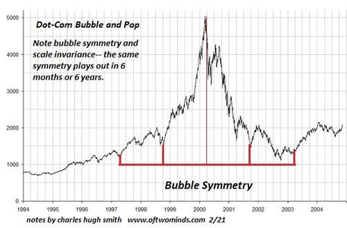6. Even if the new technology continues expanding, the speculative bubble can deflate 80%. This is the lesson of the dot-com era: that the Internet continued to expand didn’t mean the speculative bubble continued inflating: the speculative bubble is not the same thing as the actual use-value in the real world.