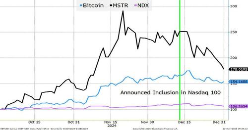 We’ve included this chart because it highlights how positive these types of announcements can be. Bitcoin and MSTR traded extremely well as speculation grew that MSTR would be included in the Nasdaq 100. It was announced on December 13th, 2024 and went into effect on December 23rd, 2024.