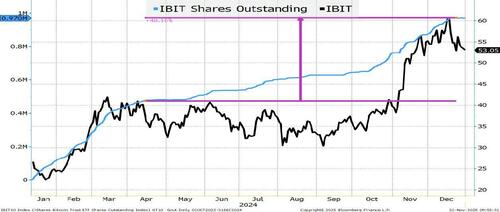 - From IBIT’s inception, on January 10th, 2024 (it seems longer than that), it reached 760 million shares by November 2024. It got to over 1.4 billion shares outstanding by April 2024. It peaked at over 1.4 billion shares. Almost every purchase since then is down. About half of the shares outstanding were issued to buyers above today’s prices. That could cause some selling pressure.