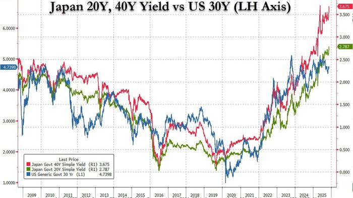 Which is why some may have missed the big store of the night which is that Japanese yields are once again breaking out in the back of the curve, with new cycle highs in the 20yr and 40yr weighing on sentiment and risk, and sending the Nikkei not only back below 50K, but below 49K, down 7% from the local record high hit on Halloween.