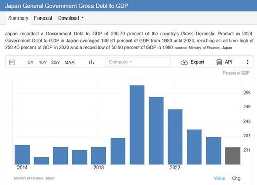 Lastly, Japan’s debt, while rising nominally, is falling as a percentage of economic activity. As we share below, its Debt-to-GDP ratio peaked at 2.58x and has since moderated to 2.32x. It is still exceptionally high but trending in the right direction. For context, the US debt-to-GDP ratio stands at 1.21x, which is considered problematic by some economists.