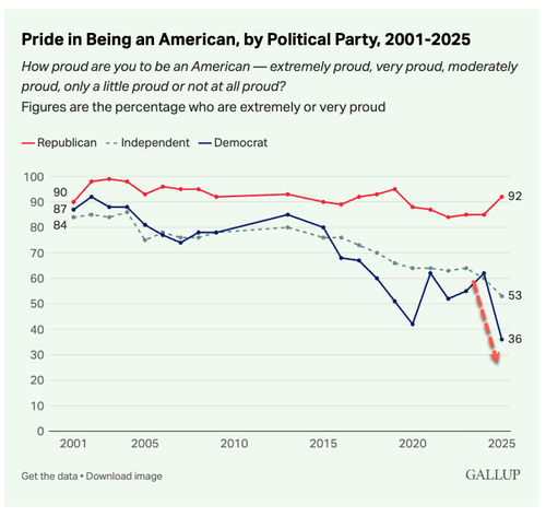 But HuffPost’s anti-American article shouldn’t come as a surprise because its readership target is deranged Democrats who increasingly hate America more and more. That data was visible in a recent 2025 Gallup poll…