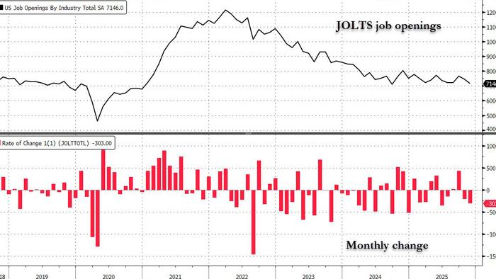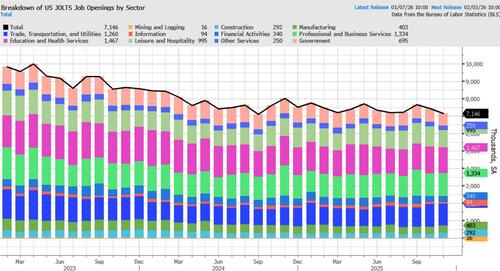While today’s ADP report was a solid rebound from the worst monthly report in years (even if it missed expectations due to a sudden plunge in California payrolls), the same could not be said for the JOLTS job opening report that followed less than two hours later, and which was another epic disaster: for the month of November (recall JOLTS lags the payrolls report by a month), the US had only 7.146 million job openings, a huge drop from the 7.670 million in October (which was conveniently revised lower to 7.449 million) and the lowest since September 2024.