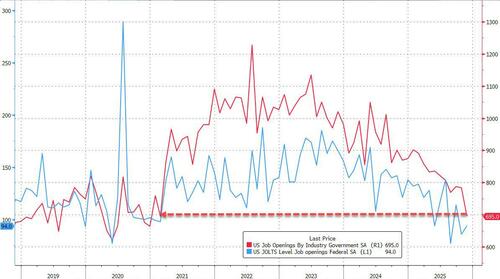 Putting it all together, despite a rather solid ADP print earlier, today’s JOLTS report was quite terrible and certainly enough to ensure that Fed rate cuts continue (assuming no dramatic improvement in Friday’s job report). The flip side, of course, is that this report took place when the government was still mostly shut down, so our advice would be to just ignore everything since it is not indicative of the current state of the US economy after it reopened shortly after Democrats captiulated without achieving anything.