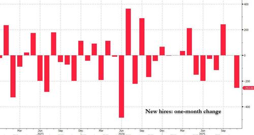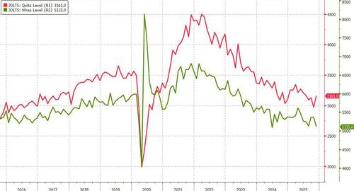 While the job openings data was ugly and potentially another harbinger of the coming jobs recession – things were even uglier below the surface, as the number of new hires tumbled by 253K – the biggest one month drrop since June 2024 – to 5.1156MM the lowest since June 2024.