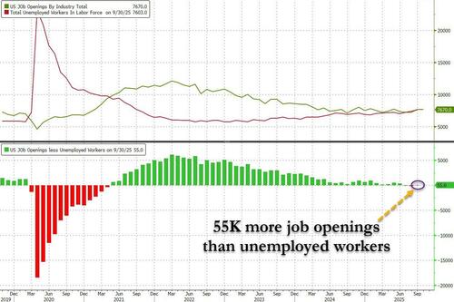 After a two month data hiatus, moments ago the BLS published the first jobs-linked report when it released the October JOLTS job openings and labor turnover survey. And following the last published JOLTS, which hit a little over two months ago on Sept 30, covering the month of August and which reported just 7.227 million job openings, the October report was unexpectedly strong, but not for what it showed for October but rather for the previously unreported September data, which came at a whopping 7.658MM, the highest since May, and the biggest one-month increase (+431K), since October 2024.