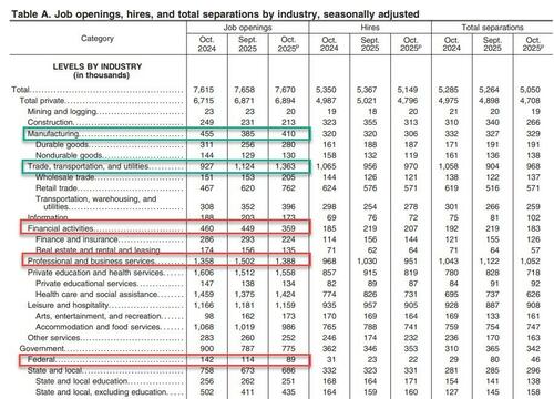 According to the BLS, there were no material monthly changes in October, expect for a notable plunge in the number of job openings in federal government (-25,000). And while that was accurate, a quick skim of the data