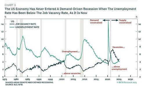 Why does this matter? Because as we discussed recently, the US never entered a recession in a period when there were more job openings than unemployed workers (i.e. the job market was supply constrained). After the previous two months, that is no longer the case.