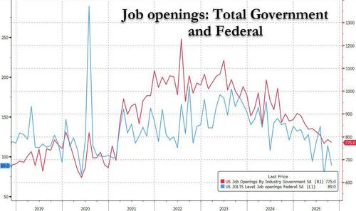 To be sure, as noted above, the best news about today’s report is that roughly around the time of the government shutdown the number of government job openings was already the lowest since Feb 2021, while the number of Federal job openings continues to be in freefall.