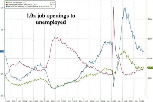 Said otherwise, in October the number of job openings to unemployed was just a fraction above 1.0x, having spent the previous two months below, which in turn was a reversal of the previous 4 years.