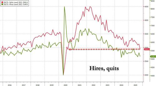 How to make sense of this data? On the surface, the JOLTS report suggests that the jobs market is much stronger than some had feared, and certainly the bottom is not falling out. It also suggests that anyone expecting an aggressive easing cycle in the immediate future will be disappointed. At the same time, the report is too close to the FOMC decision tomorrow, so it won’t change anything, and if it does impact the market, it will be odds of a January or subsequent rate cut (which will drop). At the same time, the continued collapse in both hires and quits is concerning and indicates that we can now add low quits to the “low fire, low hire” economy, which is rapidly finding a new equilibrium now that millions of illegal aliens aren’t polling the statistics, or artificially depressing wages. Neither of which makes the Fed’s role any easier…