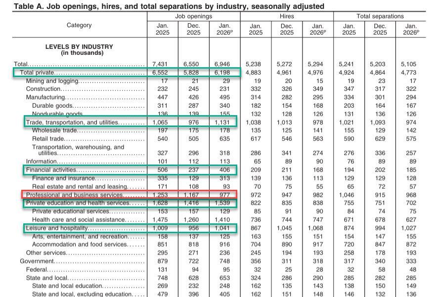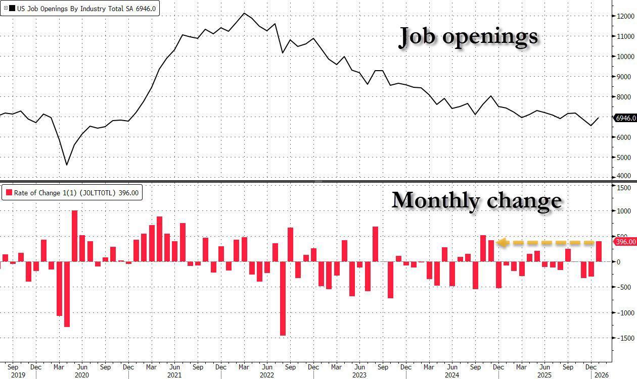 After slumping in late 2025, it has been a rocky road for the US labor market, especially after the February payrolls print shocked with how bad it was. But according to the latest JOLTS job openings and turnover report published by the BLS moments ago, by the time the February NFP picture was taking place, the seeds of a recovery may have been planted already thanks to a surge in US job openings, which rose by 396K in January, the biggest increase since Nov 2024, to 6.946 million from 6.550 million and the highest since last October.
