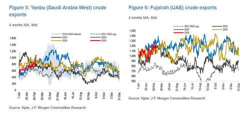And yet, despite disruptions around the strait, alternative export routes remain underutilized, with both Saudi Arabia and the UAE operating their bypass pipelines below available spare capacity: according to JPMorgan, roughly 1.6 mbd of spare export capacity is currently going unused.
