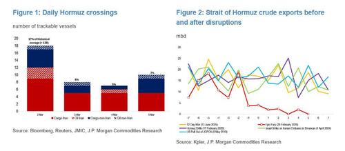 Unable to move crude through the waterway, JPM reminds its clients that producers have effectively shifted storage onto the sea and other facilities. Since the end of February, roughly 76 million barrels (mb) of crude have accumulated—about 46 mb on tankers, 22 mb at refiners, and 8 mb in commercial storage, or about 4.5 days of regional crude exports; most of the inventory build appears to be concentrated in Saudi Arabia.