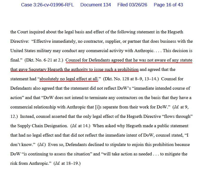 At the March 24 hearing, DoW counsel conceded that portions of the Hegseth Directive had “absolutely no legal effect” on their own and that DoW did not intend to terminate unrelated commercial relationships – yet declined to stipulate to an injunction, citing ongoing “assessment.”