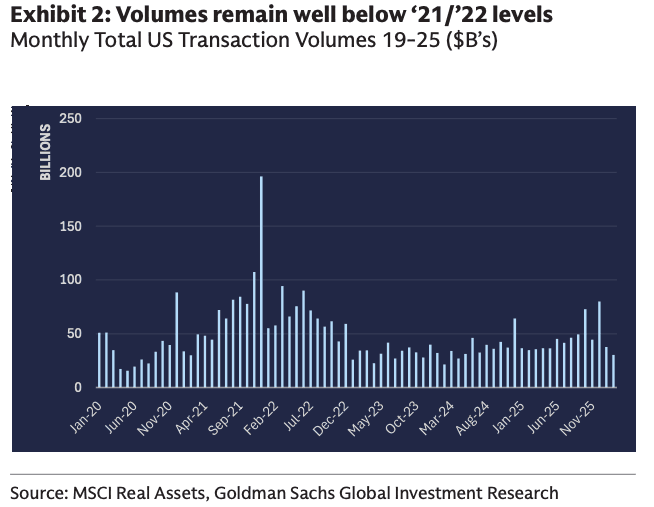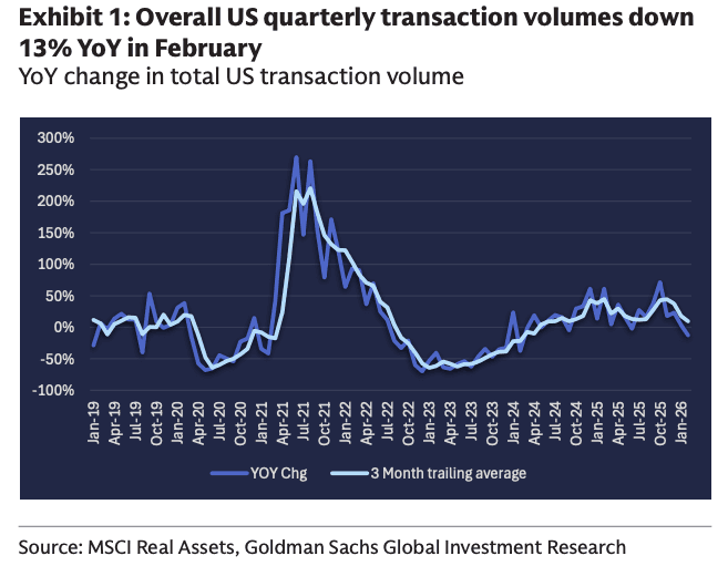 Goldman real estate analyst Julien Blouin wrote Wednesday that the initial February reading on CRE transaction volumes showed a 13% year-over-year decline. He noted that transaction data from MSCI Real Assets is typically “revised materially higher” and said the early print is not a major cause for concern.