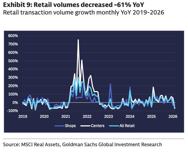 February U.S. commercial real estate transaction activity appeared soft on the surface, but Goldman analysts believe the weak initial print will likely be revised meaningfully higher. The most notable area of weakness in last month’s transaction data was across the retail space, which is not especially surprising as the K-shaped economy continues to pressure lower-income consumers.