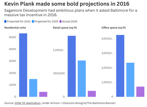Representatives for Plank’s real estate development company, Sagamore Ventures, and its equity partner, Goldman Sachs, told the local paper, The Baltimore Banner, that they will remain owners of the current Baltimore Peninsula development but will exit the rest of the project, much of which remains underdeveloped.