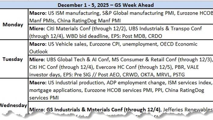 Finally, looking at just the US, Goldman writes that the key economic data releases this week are the ISM manufacturing and services indexes on Monday and Wednesday and core PCE inflation and the University of Michigan report on Friday. There are no speaking engagements by Fed officials this week, reflecting the FOMC’s blackout period.
