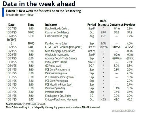Finally, looking at just the US, several key data releases will almost certainly be postponed this week because of the government shutdown, including the durable goods report scheduled for release on Monday, the advance goods trade balance scheduled on Wednesday, the Q3 advance GDP report scheduled on Thursday, and the core PCE inflation scheduled on Friday. The Department of Labor will also postpone the official release of the jobless claims report if the government shutdown continues through Thursday, but preliminary state-level claims data will likely be available. There are no speaking engagements by Fed officials this week, reflecting the FOMC’s blackout period.