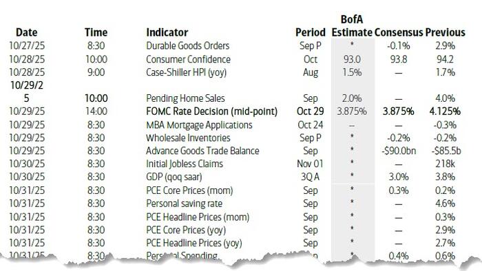 • 02:00 PM FOMC statement, October 28-29 meeting: As discussed in our FOMC preview, we expect the FOMC to deliver another 25bp rate cut to 3.75-4% at its October meeting. The median projection in the September dot plot showed a baseline of three cuts this year, and with the official data paused by the government shutdown and alternative labor market data mixed at best, there is no reason to deviate from the plan to support the labor market for now. We do not expect formal guidance about the December meeting, but if Chair Powell is asked, he will likely be comfortable referencing the September dots, which imply a third cut in December.