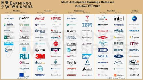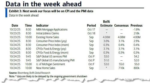 Looking at just the US, Goldman writes that the September CPI report—originally scheduled for release last week—will be released on Friday. The new home sales report on Thursday will be postponed if the federal government shutdown continues until then. The Department of Labor will also postpone the official release of the jobless claims report if the government shutdown continues through Thursday, but preliminary state-level claims data will likely be available. There are no speaking engagements by Fed officials this week, reflecting the FOMC’s blackout period.