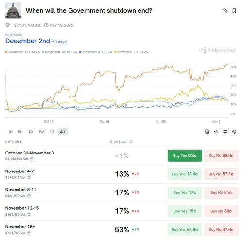 As DB’s Jim Reid writes, one of this week’s major landmarks is that, by midnight tomorrow, the current US government shutdown will officially become the longest in history—assuming there isn’t a highly unlikely near-term resolution. This will surpass the previous record of 35 days, which ended on 25 January 2019. There is growing speculation that we may be nearing the last stages of the shutdown, driven by increased cross-party dialogue, mounting public pressure, and economic and political considerations. One example is the US food aid program, which supports around 42 million Americans and may not have sufficient funding to last through November.
