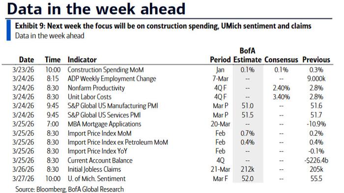 Finally, looking at just the US, Goldman writes that the key economic data releases this week are the productivity and costs report on Tuesday and the University of Michigan report on Friday. There are several speaking engagements by Fed officials this week, including events with Governors Miran, Barr, and Cook, and Vice Chair Jefferson.