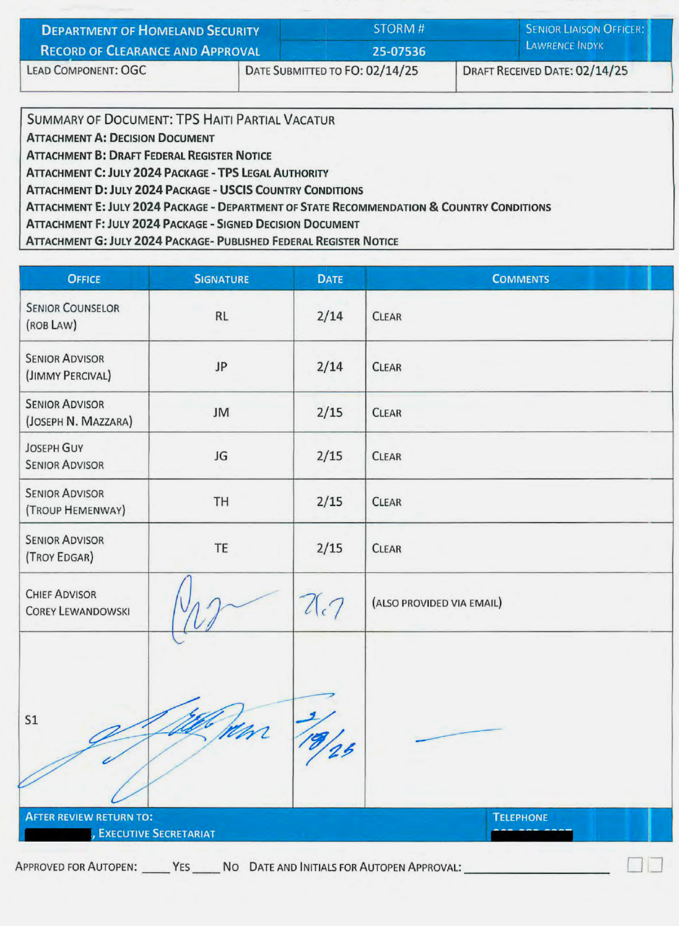 A similar sign-off process exists for other policy decisions at DHS. One of the checklists, about rolling back protections for Haitians in the U.S., emerged in litigation last year. It featured the signatures of several top DHS advisers. Under them was Lewandowski’s signature, and then Noem’s.