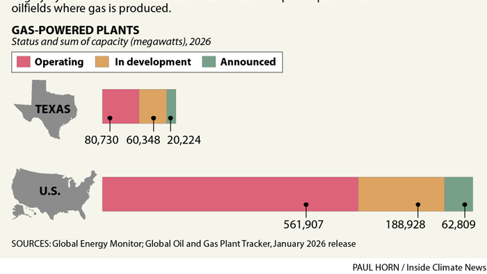 These are enormous volumes of energy, enough to power mid-sized cities. During 2025, the pipeline of gas power projects in development in Texas grew by nearly 58 GW of generation capacity, according to the GEM report, more than the peak power demand of the state of California.