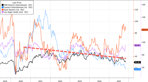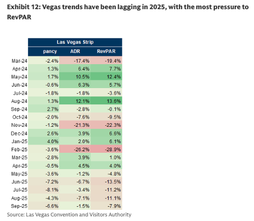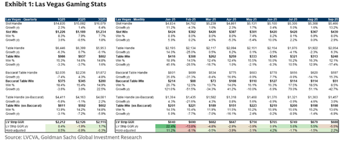 A Las Vegas downturn first emerged on our radar early this past summer and has only deepened into fall. We previously noted that the days of cheap room rates and discounted buffets to lure gamblers are long gone, replaced by steep markups on even the smallest of items. For many working-class Americans, Vegas has become unaffordable, and the latest data from Goldman analysts show the Strip slowdown persisted through September.